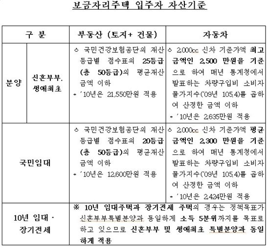 국민임대주택의 경우 소득기준을 도시근로자 가구당 월평균 소득의 70%로 두고 있는 점을 감안해 자산기준을 적용한다. 토지 및 건물가액 기준은 20등급(소득 4분위)를 적용, 평균 재산금액(금년 1만2600만원) 이하를 기준으로 한다.
