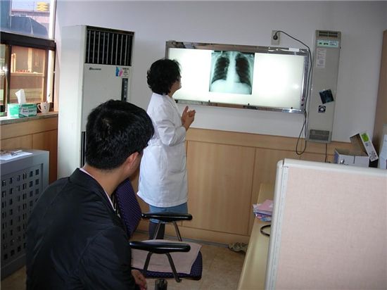 $pos="C";$title="";$txt="수검자가 X-선 촬영 사진을 보면 검진 결과를 설명듣고 있다.