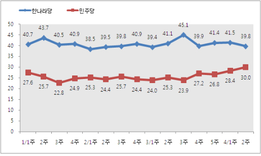 여론조사전문기관 리얼미터(대표 이택수)가 20일 공개한 4월 셋째주 정례 여론조사 결과에 따르면 정당 지지율에서 한나라당은 지난주 대비 1.7%p 하락한 39.8%를 기록한 반면, 민주당은 1.6%p 상승한 30%를 기록했다.