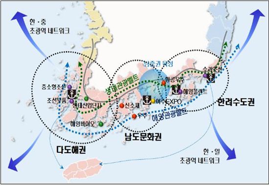 우선 여수~사천~통영~거제간 한려수도권은 수려한 자연·청정해역을 바탕으로 외국인 관광단지, 친환경 리조트, 가족휴양단지 등 체류형 휴양지대로 개발한다. 이 사업은 하반기부터 1차 시범사업으로 추진키로 했다.
