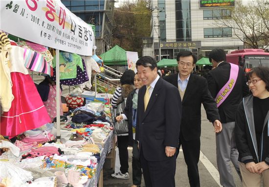 [아시아경제 박종일 기자]최임광 서대문구청장 권한대행이 22일 서대문구청 광장에서 열린 ‘봄맞이 나눔장터’에 나온 유아복 코너를 둘러보고 있자.이 행사는 서대문새마을부녀회와 서대문건강가정지원센터가 주관하는 '봄맞이 나눔장터’로 육아용품을 판매해 저소득 출산 가정에 지원할 예정인 ‘사랑둥이 나눔장터’와 생필품과 먹거리를 나누는 '사랑 나눔 장터’로 운영된다. 여성 취업 상담 코너도 마련돼 큰 호응을 얻었다.