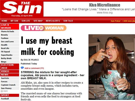 블레이크는 “흔히들 모유로 만든 음식을 어떻게 먹느냐고 생각할지 모르지만 모유에는 우유에서 찾아볼 수 없는 여러 비타민이 풍부하다”며 “불결한 젖소의 우유보다 깨끗하고 건강한 여성의 모유가 낫지 않느냐”고 반문하기도.