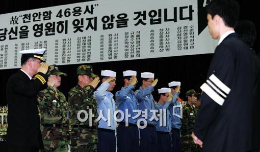 [평택=사진공동취재단] 26일 평택 해군2함대사령부에 마련된 `천안함 46용사 분향소'에서 동료 장병들이 가족들에게 경례를 하고 있다.