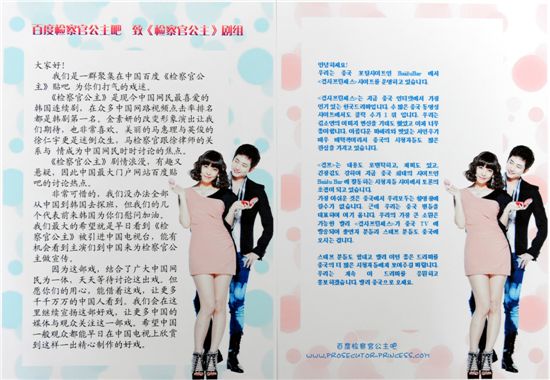 또 최근 ‘검사 프린세스’팀 중국 최대 포털사이트 'Baidu Bar' 운영진을 포함한 중국팬들의 방문을 받았고, 이 자리에서 중국내에서 ‘검사 프린세스’의 뜨거운 관심을 보여주듯 중국어와 한국어로 번역된 편지를 건네받았다.