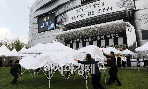 [아시아경제 이재문 기자] 27일 오전 서울광장에 설치된 천안함 침몰사고의 희생 장병 합동분향소에서 비가 그치고 강풍이 불자 관계자들이 천막을 접고 있다.