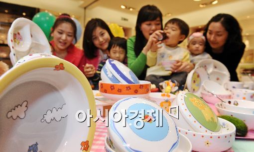 [아시아경제 이재문 기자] 한국도자기가 어린이날을 일주일여 앞둔 27일 오전 서울 소공동 롯데백화점 본점에서 영유아 전용 '쥬쥬 치코세트' 출시를 기념해 도자기로 익히는 우리아이 식사예절 행사를 진행하고 있다.