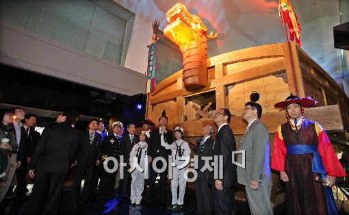[아시아경제 이재문 기자] 28일 세종문화회관 광화문광장 지하에서 열린 '충무공 이야기' 개관식에서 오세훈 서울시장을 비롯한 참석자들이 실제 크기의 55%로 제작된 거북선 모형을 관람하고 있다.