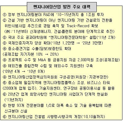 정부는 우선 올해 하반기 안으로 수익성, 성장성을 고려한 15대 전략분야를 발굴, 분야별 연구개발(R&D) 추진전략을 수립하고 지원규모를 올해 1154억원을 시작으로 2015년까지 5년간 모두 1조원을 투입하기로 했다. 국내외에서 발주 예정인 사업의 컨소시엄에 국내 기업이 활발히 참여토록 하고 해상풍력발전소, 초장대 교량, LNG 플랜트 등 공공사업을 조기에 추진해 해외 대형 사업수주에 필요한 경험을 축적도록 할 계획이다.