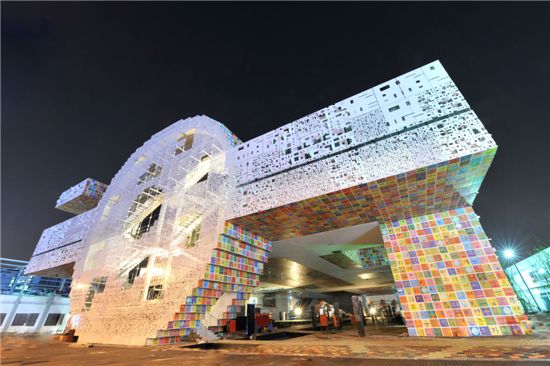 380억원의 예산이 투입된 한국관은 안팎으로 독특하다. 외관은 한글 자모의 기하학적인 특성을 입체적으로 표현한 '한글픽셀'로 이뤄졌다. 내부는 재미 설치예술작가 강익중의 작품인 3만5000개의 '아트픽셀'로 장식됐다.