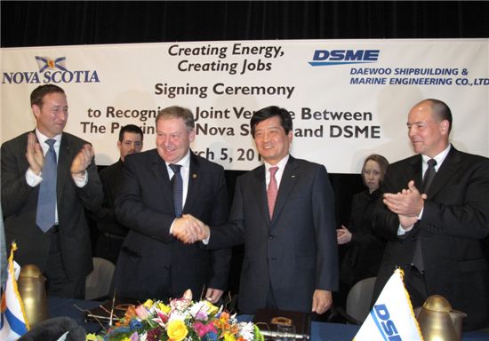 $pos="C";$title="대우조선해양, 캐나다에 풍력공장 설립";$txt="남상태 대우조선해양 사장(오른쪽에서 두번째)과 대럴 덱스터 노바 스코시아 주지사(오른쪽에서 세 번째)이 지난 3월 5일(현지시간) 캐나다 노바스코시아 핼리팩스에서 합작 풍력발전기 생산법인 설립에 합의한 뒤 악수하고 있다.";$size="550,384,0";$no="2010030809053348061_1.jpg";@include $libDir . "/image_check.php";?>
