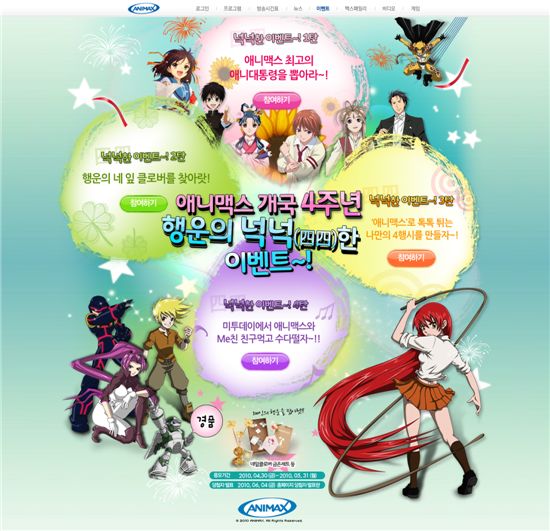 우선, 4색 이벤트는 '남녀 애니 캐릭터 각 4인 후보 중 애니 대통령을 선발하는 온라인 투표''네 잎 클로버의 개수를 맞추는 숨은 그림찾기''애.니.맥.스 4음절을 활용한 4행시 짓기''미투데이 애니맥스에서 4번째 친구 맺기' 등 모두 4와 관련된 이벤트다.
