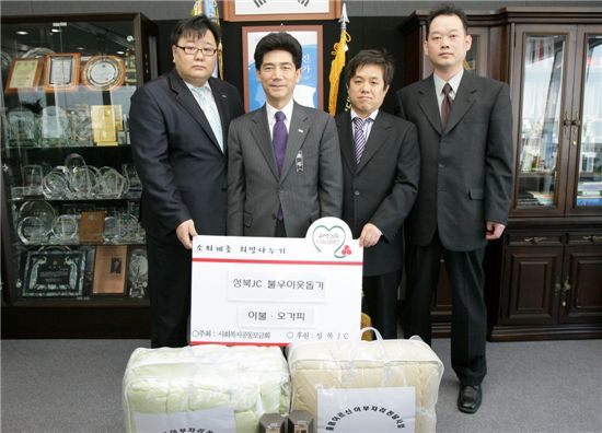 [아시아경제 박종일 기자]성북JC(청년회의소)는 29일 오후 소외계층 희망나누기의 일환으로 저소득 홀몸노인 돕기에 사용해 달라며 이불 20채와 오가피 20개를 성북구청에 전달했다.