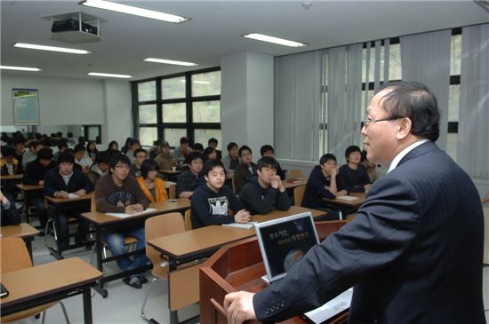 김 청장은 앱창작터 개소식을 마치고 곧바로 공과대 강의실을 찾았다. 학생들에게 1인 창조기업의 중요성을 설명하기 위해서다.