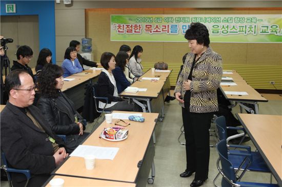 수업은 ▲음높이, 음색, 발성, 호흡 등 음성 교정 트레이닝 ▲전달력을 높이는 발음훈련 및 목소리 강약 조절 훈련 ▲전화 및 방문 고객응대 시 밝고 신뢰감 있는 이미지를 주는 표현기술 실습 등과 함께 다양한 민원상황에서의 우수 응대사례 시뮬레이션도 실시하여 이론을 학습하고 시험하는 시간으로 꾸며졌다.