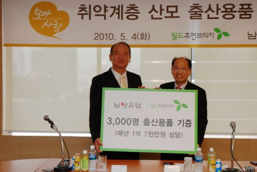 이번 협약을 통해 남양유업은 월드휴먼브리지의 ‘모아사랑’ 프로젝트에 매년 3000명분의 출산용품(약 1억7000만원 상당)을 무상 기증하기로 했다. 기증 품목은 분유, 젖병, 속싸게, 베넷저고리, 가제수건 등 신생아 출산에 필수적인 용품들이다.