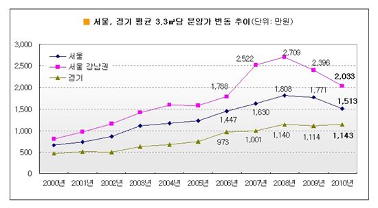 [아시아경제 조민서 기자]서울 아파트의 3.3㎡당 분양가가 4년전 수준으로 떨어진 것으로 나타났다. 반면 경기도는 최고가를 경신해 서울과 대조적인 모습을 보였다.