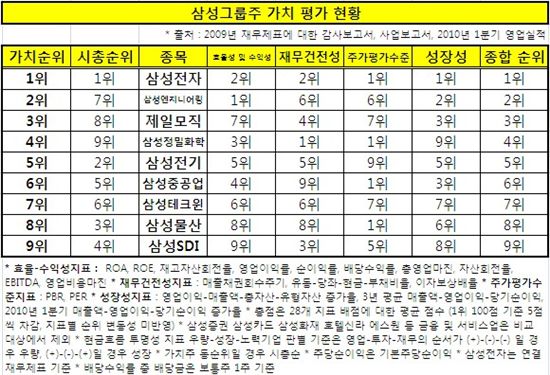 '효율성-수익성-재무건전성-성장성'에 비해 저평가가 큰 가치주를 찾아내는 것은 숙명과 가깝다. 그리고 이 모든 가치를 평가하는데는 대차대조표, 손익계산서, 현금흐름표가 핵심이다. 이 같은 맥락에서 삼성그룹 계열사(삼성전자 삼성전기 삼성물산 삼성SDI 삼성중공업 삼성테크윈 삼성엔지니어링 제일모직 삼성정밀화학, 이상 총 9개사 시가총액 상위순)의 지난해 재무제표에 대한 감사보고서 및 지난 1ㆍ4분기 영업실적 보고서를 종합 분석해본 결과, 삼성전자가 부동의 1위로 나타났다. 효율-수익성 및 재무건전성 부문에서 2위를 기록했지만 성장성 부문에서도 1위자리를 굳건히 했다. 주가 평가 수준도 삼성그룹 계열사 중 가장 저평가 상태인 것으로 나타나 추가 상승 여력도 충분하다는 분석이 내려졌다.