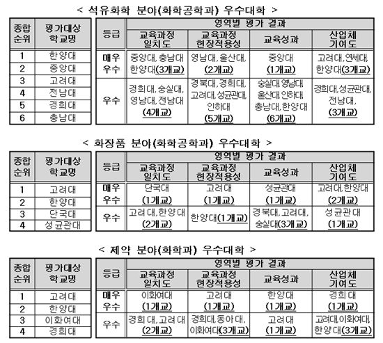 평가 결과 석유화학 분야(화학공학과)에서는 14곳의 학교가 평가에 참여해 한양대가 최고 점수를 받았고 중앙대, 고려대, 전남대, 경희대, 충남대 등이 그 뒤를 이었다.