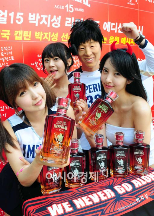[아시아경제 이재문 기자] 페르노리카코리아가 9일 서울 광화문 청계광장에서 축구대표팀 박지성 선수의 선전을 기원, '임페리얼15 박지성 리미티드 에디션'을 출시했다.'박지성 위스키'로 불리는 이 제품은 스코틀랜드 전역에서 엄선한 최소 15년산 이상의 고급 원액에 박지성 선수가 선호하는 부드러운 향과 맛을 반영한 것이 특징이다.