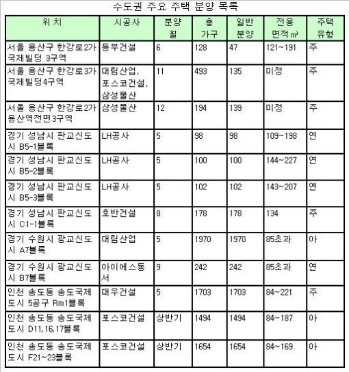 [아시아경제 이은정 기자] 보금자리주택의 폭격에 숨죽이던 민간 건설사들이 서울 용산과 경기 광교·판교, 인천 송도 등 수도권 빅3 지역을 중심으로 분양물량을 쏟아낼 예정이라 분양시장 판도변화가 주목된다.