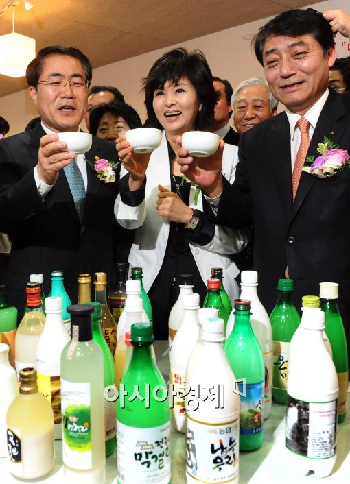 [아시아경제 이재문 기자] 농림수산식품부 주최로 10일 서울 필동 한국의 집에서 열린 한국 축구 국가대표팀 '2010 남아공 월드컵' 16강 진출기원 '16강 막걸리 선발대회'에서 장태평 농림부 장관이 참석자들과 월드컵 16강을 기원하고 있다. 이번에 선정된 16강 막걸리는 월드컵 기간에 서울역 광장, 청계광장 등에서 열릴 막걸리 페스티벌 행사와 월드컵 응원전 등에도 활용된다.