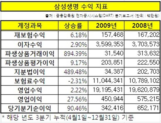 삼성생명의 지난해 3분기 누적 영업수익은 직전해 동기 대비 2.22% 늘어난 19조6208억원을 기록했다. 보다 내실있는 실적 지표로 활용되는 영업이익과 당기순이익의 경우 더욱 탄력적인 성장세를 시현했다. 삼성생명의 지난해 3분기 누적 영업이익과 당기순이익은 직전해 동기 대비 각각 27.56%, 90.46% 증가한 5752억원, 6521억원으로 집계돼 금융위기 여파에도 불구하고 안정적인 성장세를 보인 것으로 나타났다.