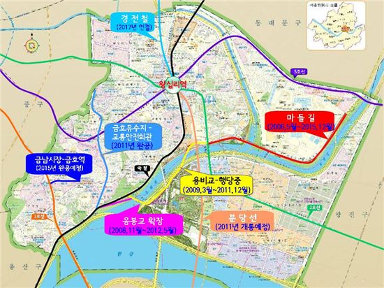 상습정체지역인 성수대교 북단의 교통량 분산과 원할한 교통흐름을 확보하기 위한 용비교∼행당중학교(도로개설 폭 6∼16.3m, 길이1850m, 1∼3차로) 도로개설 사업은 2012년까지 추진된다.