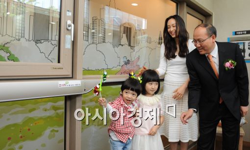 [아시아경제 이재문 기자] LG하우시스가 12일 오전 서울 삼성동 코엑스에서 'Green Thinking Green Doing'을 주재로 친환경 비전을 담은 창호 신제품을 선보이고 있다. 이날 LG아우시스 모델 이나영과 한명호 LG하우시스 대표가 어린이들과 함께 세계최초로 선보이는 '자동환기창'을 체험하고 있다.
