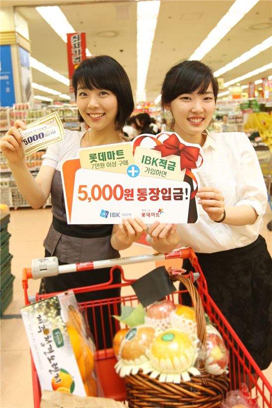 이번 이벤트는 롯데마트에서 7만원 이상 구매고객에게 '기업은행 통장개설 입금지원 쿠폰(5000원권)'을 증정하고 쿠폰을 소지한 고객이 적금통장을 개설하면 초입금으로 5000원을 입금해 준다.