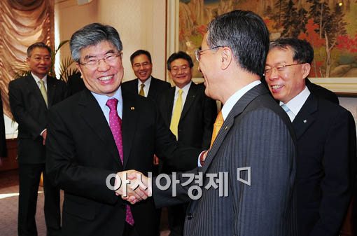 [아시아경제 윤동주 기자] 14일 오전 서울 중구 한국은행에서 열린 금융협의회에 참석한 김중수 한은총재가 이종휘 우리은행장과 반갑게 인사를 나누고 있다.