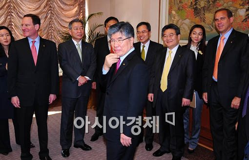 [아시아경제 윤동주 기자] 14일 오전 서울 중구 한국은행에서 열린 금융협의회에 참석한 김중수 한은총재가 시중은행장들과 최근 금융현안에 대해 의견을 나누고 있다.