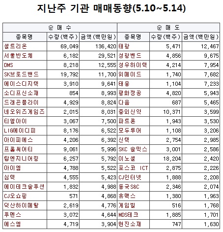 기관은 셀트리온을 1364억원 순매수한 것을 비롯해 서울반도체(295억원 순매수)와 DMS(126억원), SK브로드밴드(117억원), 에이스디지텍(96억원), 소디프신소재(90억원) 등을 집중적으로 사들였다.