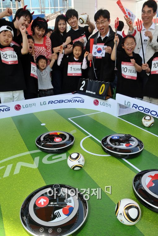 [아시아경제 이재문 기자] LG전자가 2010년 남아공월드컵 태극전사들의 선전을 기원하기 위해 16일 오전 서울 용산 아이파크몰 4층 이벤트 홀에서 '2010 LG 로보킹 축구대회'를 진행하고 있다. 로봇청소기를 이용한 이색 축구대회는 1대의 로봇청소기를 리모컨으로 조작해 상대방의 골문에 공을 많이 넣는 팀이 승리하는 방식이다.