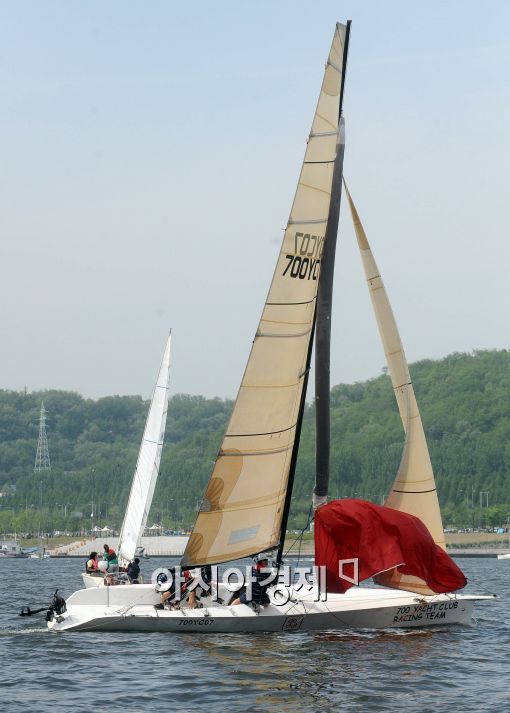[아시아경제 이재문 기자] 16일 오후 서울 가양대교와 성산대교 사이 700 요트클럽 앞 한강에서 열린 서울국제요트대회에서 참가자들이 힘찬 레이스를 펼치고 있다.