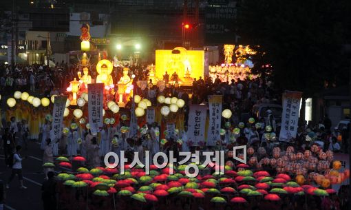 [아시아경제 이재문 기자] 불기 2554년 부처님 오신 날을 봉축하는 형형색색의 연등행렬이 16일 저녁 서울 흥인지문에서 조계사로 향하고 있다.