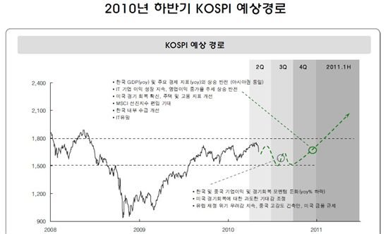 구 센터장은 "이러한 요인으로 3분기 국내증시는 횡보 국면을 보이다가 4분기부터 빠른 속도로 상승해 지수 2000을 향한 출발점이 될 것"이라며 "2011년 상반기에는 지수 2000을 돌파하는 강세장을 예상한다"고 전했다. 코스피는 경기모멘텀을 선행적으로 반영하는데 4분기에는 경제지표들이 상승 추세로 전환될 것으로 보이고 채권투자로 몰렸던 국내 기관 및 개인 자금들이 주식시장으로 빠르게 이동할 것이라는 분석이다.