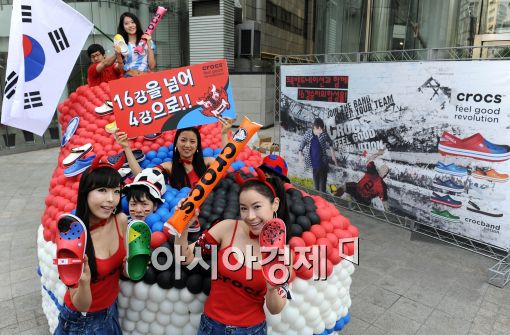 [아시아경제 이재문 기자]라이프스타일 슈즈 크록스가 17일 오전 서울 청계광장에서 2010 남아공 월드컵을 맞아 한정판으로 출시한 ‘크록밴드 네이션’ 론칭을 기념해 축구 대표팀의 선전과 16강 진출을 성원하는 이벤트를 진행하고 있다.