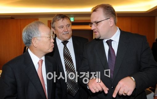 [아시아경제 이재문 기자] 18일 서울 소공동 롯데호텔에서 벨라루스 상공회의소 회장단과 양국 간 경제협력 방안을 논의하는 자리에서 손경식(왼쪽부터) 대한상공회의소 회장과 미칼라이 사카르 벨라루스 상의 부회장, 알렉산드르 구르야노프 주한 벨라루스 대사가 간담회에 앞서 대화를 나누고 있다.