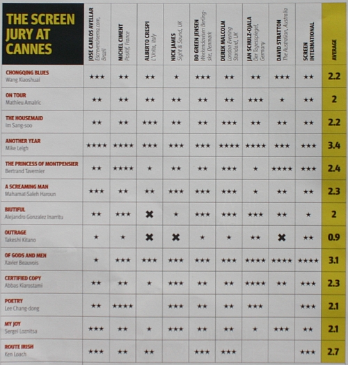 지난해 칸영화제 심사위원상을 받은 박찬욱 감독의 '박쥐'는 당시 10개 매체로부터 2.4점을 받았으며 이번 경쟁작 '하녀'는 2.2점을 받았다.