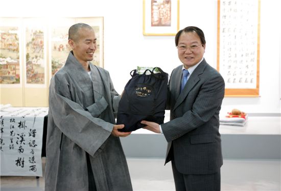 20일 오후 길상사의 덕현 주지스님은 사찰 인근 한국서예관에서 배진섭 성북구청장 권한대행에게 설탕과 밀가루 참치 식용류 내복 등이 들어 있는 선물주머니를 전했다.