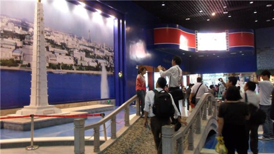 입구에 들어서자 마자 5미터쯤 되어 보이는 대동강변 주체사상탑 모형과 평양시내를 담은 사진이 눈에 들어왔다.
