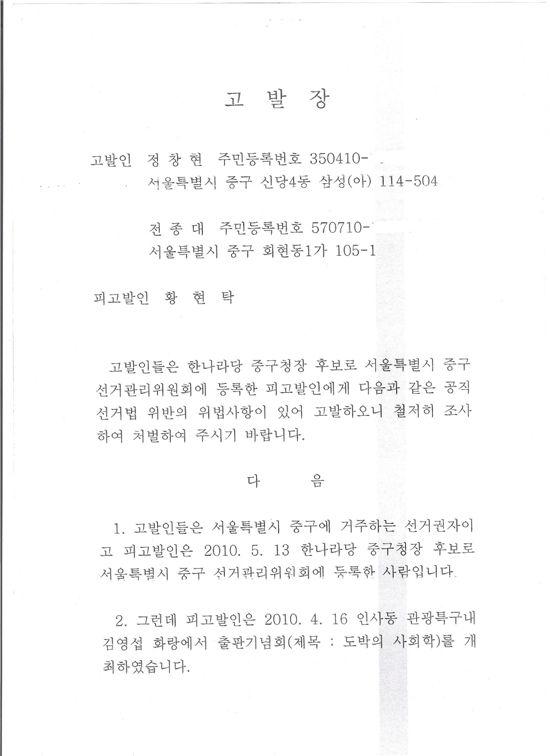 서울 중구 신당동에 거주하는 정창현 씨와 회현동 1가에 주소를 둔 전종대씨는 지난 19일 서울 중부경찰서에 황현탁 후보를 선거법 위반으로 혐의로 고발장을 접수했다.