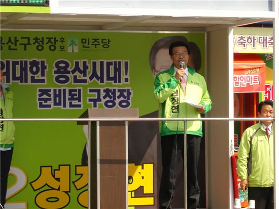 [아시아경제 박종일 기자]성장현 민주당 용산구청장 후보는 21일 거리유세를 통해 호화청사 건립문제로 실추된 용산의 자존심을 되찾아야 한다고 호소했다.