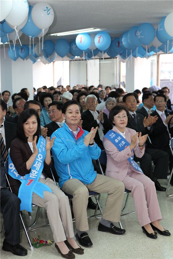 이날 오후 4시 선거사무소에서 열린 출정식에는 오세훈 서울시장 후보 부인과 현직 공성진 한나라당 공성진 최고위원, 이종구 의원, 김숙희 전 교육부장관 등 500여명이 참석했다.