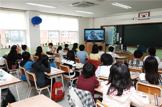 지난 15일 경남 진해시 풍호초등학교 6학년 4반 교실에서 수업을 받던 김태형군(12)은 교실 앞 대형 모니터 화면속에 나온 아버지 김홍석씨(50·STX조선해양 협력업체 (주)태강 기사)의 목소리를 듣고는 눈물을 감출 수 없었다.