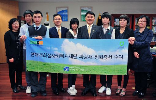 [아시아경제 조인경 기자] 경청호 현대백화점그룹 부회장(사진 왼쪽에서 네번째)은 25일 서울 정부중앙청사 소방방재청 청장실에서 소방방재청 박연수 청장(왼쪽 여섯번째)과 함께 순직소방관 자녀 35명에게 '파랑새 장학금' 1억원을 전달했다.