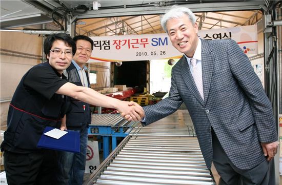 $pos="C";$title="";$txt="";$size="550,361,0";$no="2010052609423869558_1.jpg";@include $libDir . "/image_check.php";?>[아시아경제 손현진 기자]26일 서울 용산구 용산터미널에서 열린 장기근속 배송기사 시상식에서 CJ GLS 택배사업본부장 손관수 부사장(오른쪽)이 장기근속자에게 감사장을 전달하고 있다. 이날 CJ GLS에서는 전국적으로 10년 이상 근속 12명, 5년 이상 근속 117명 등 총 129명이 장기근속자로 선정돼 감사장 및 소정의 상품을 받았다.