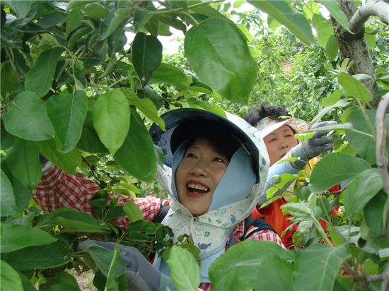 이들은 1조에 8∼9명씩 4개 조로 나뉘어 9900㎡ 면적의 과수원에서 사과솎기를 했다.