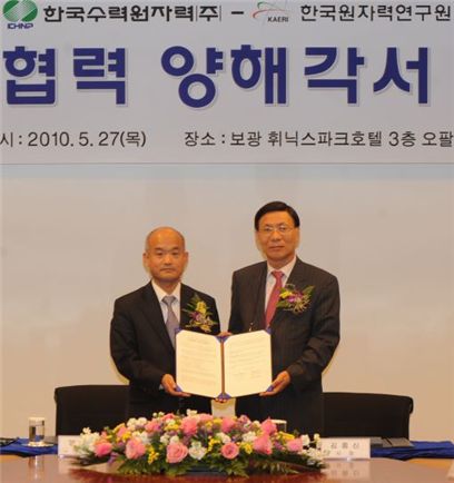 $pos="C";$title="한수원";$txt="";$size="408,434,0";$no="201005280644352720257A_1.jpg";@include $libDir . "/image_check.php";?>[아시아경제 이경호 기자]김종신 한국수력원자력 사장(오른쪽)과 양명승 한국원자력연구원장이 27일 오후 강원도 평창 휘닉스파크에서 원자력 기술개발과 원자력산업 발전을 위한 상호협력을 강화키로 하는 기술협력 양해각서에 서명한 뒤 각서를 들어보이고 있다.