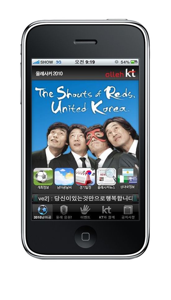 KT 무선데이터사업본부 한원식 상무는 “축구국가대표팀 공식후원사로서남아공 월드컵 16강을 기원하며 아이폰으로 응원을 즐길 수 있는 앱을 선보였다”며 “올레사커가 월드컵 응원에 재미를 더하는 창의적인 응원도구로 널리 인기를 모을 것으로 기대한다”고 말했다.